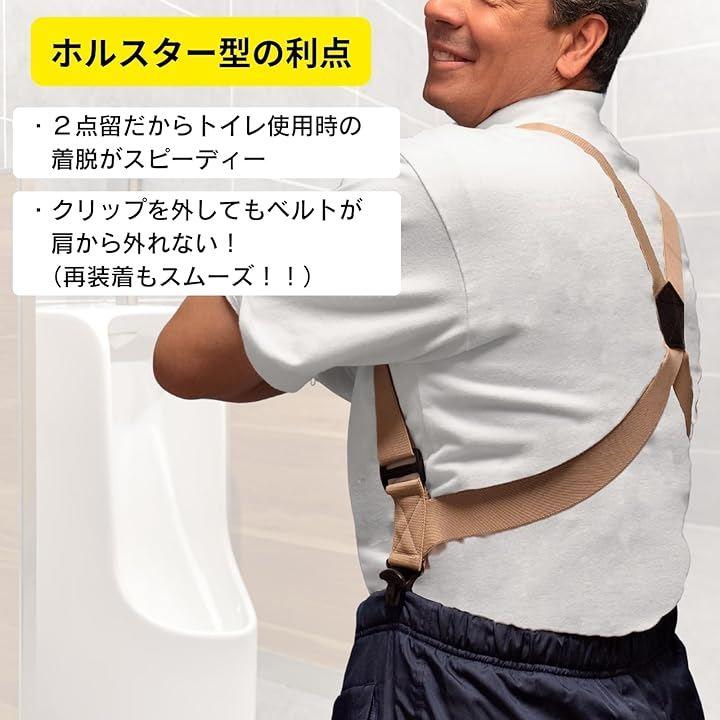 「ホルスター型で着脱簡単」2点留めのホルスター型サスペンダーは、ベルトが肩からずり落ちない設計で、着脱がスムーズ。