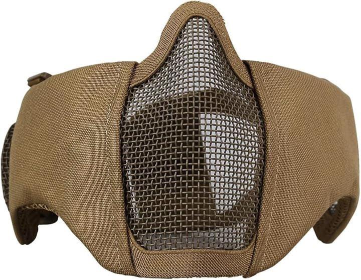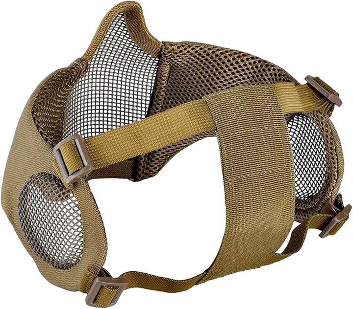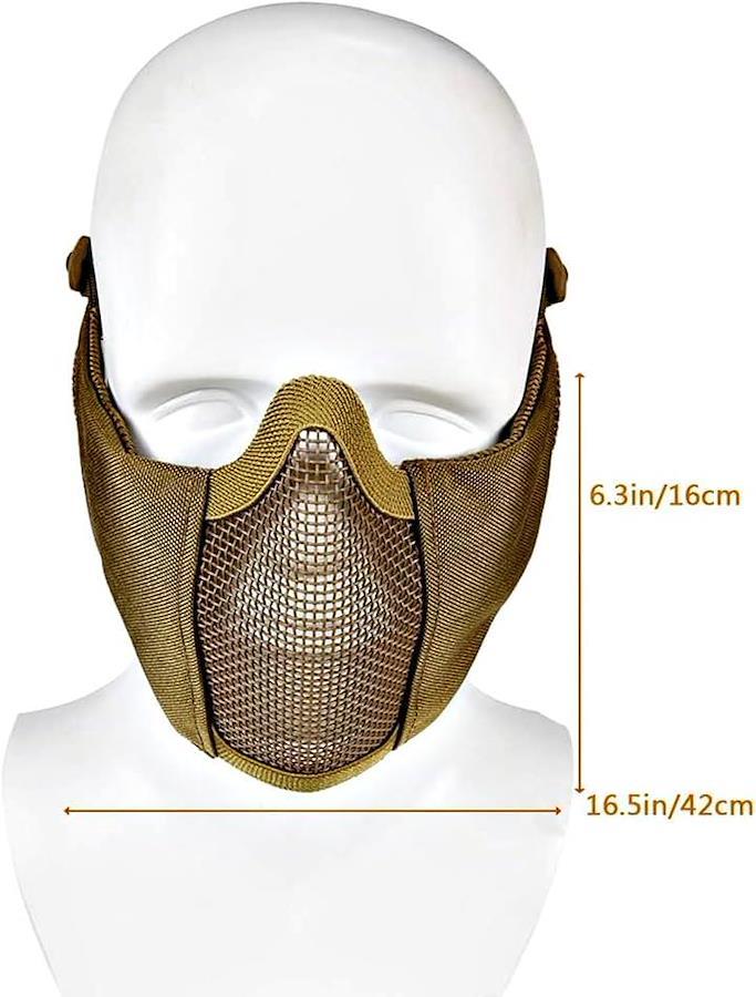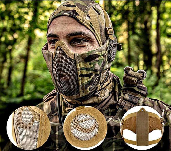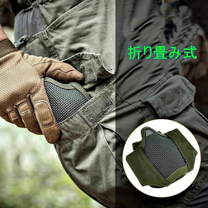 「特徴」(1)強度:金属メッシュでBB弾から口元や前歯、耳をしっかり保護します(2)通気性:口元から鼻にかけて金属メッシュ素材になっているので通気性が良くゴーグルが曇りにくいです(3)頬付けOK:頬の部分はソフトパッド入りで自然な頬付けの感覚を得られます(4)携帯性:折り畳み式で軽量コンパクトです(5)着脱:ハーフタイプなので脱着が楽です(5)素材:肌触りの良いポリエステル素材で伸縮性、通気性、吸水性が良く長時間の装着でも快適なフィット感です(6)調整可能:ゴムバンド・アジャスターによって長さを自由に調整できるフリーサイズです。