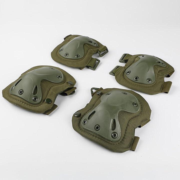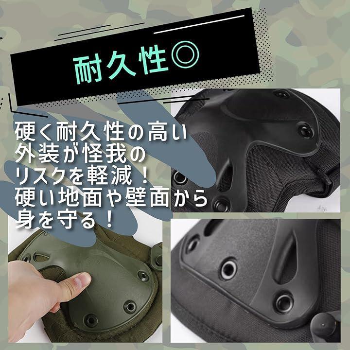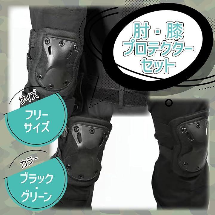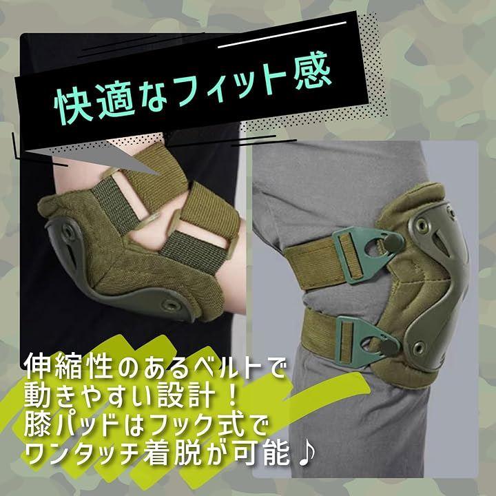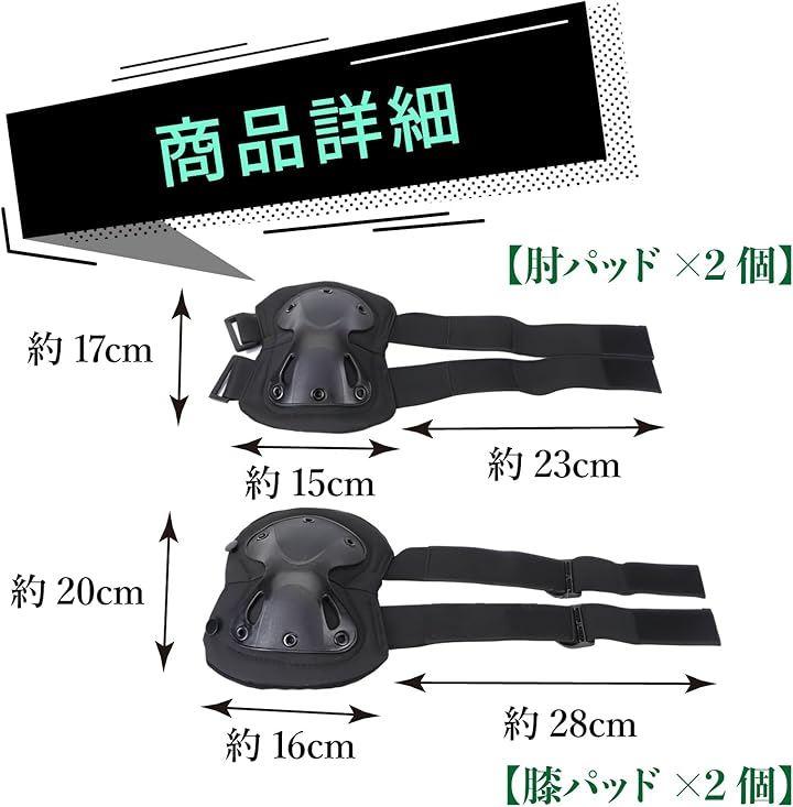 「商品詳細」セット内容:肘パッドx2(左右)、膝パッドx2(左右) カラー:ブラック/グリーン(迷彩) サイズ:肘パッド約15x17cm ベルト約23cm 膝パッド約16x20cm ベルト約28cm 材質:PE、PVC
