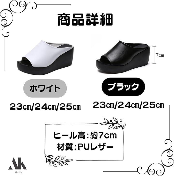 商品スペック」サイズ:23cm、24cm、25cm ヒールの高さ:約7cm カラー:ブラック、ホワイト 素材:合成皮革(PU)