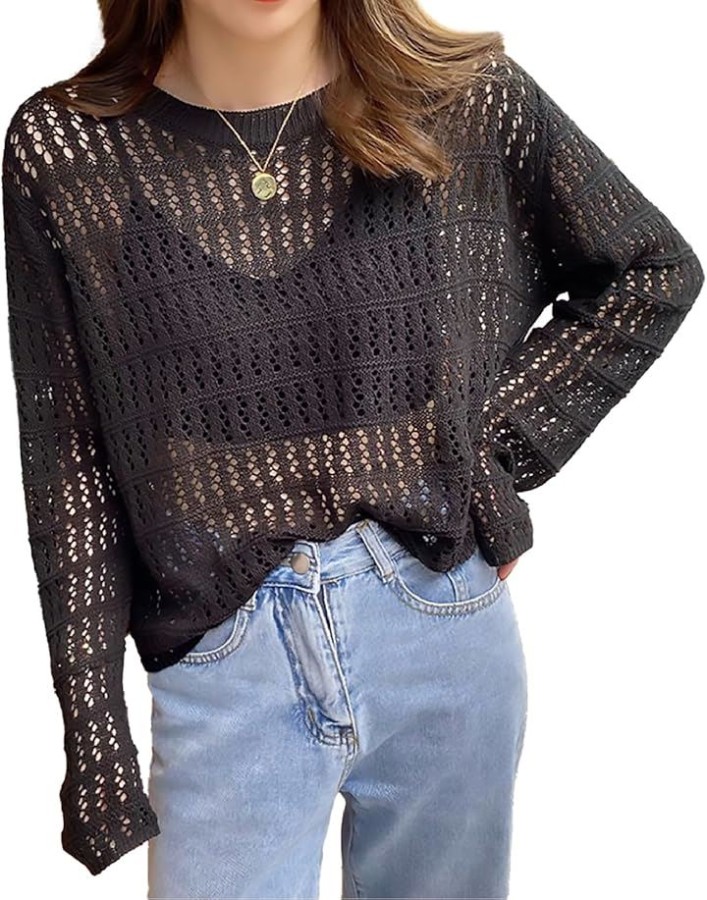 Summer knit top for women, openwork knit, long sleeves, chunky knit, lightweight, loose fit, suitable for spring and summer, sheer, stylish, casual, resort wear, can be worn over swimwear, beachwear.