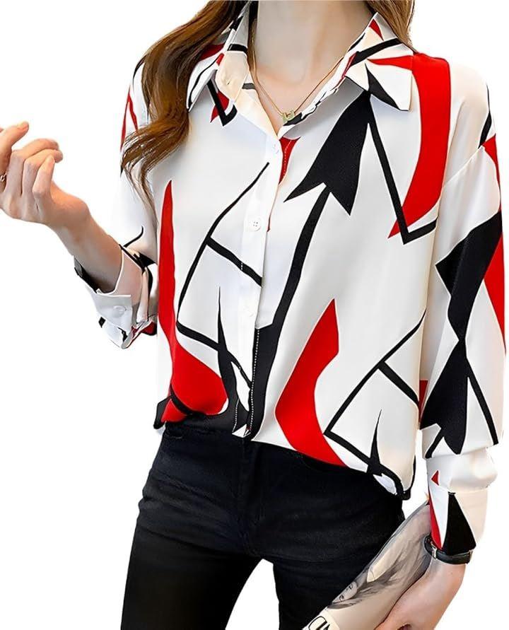 ブラウス シャツ レディースは、上品でモダンな幾何学模様が特徴です。