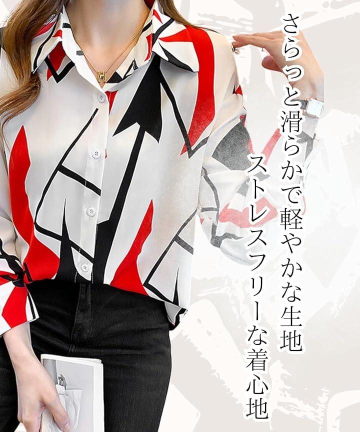 「サラッと心地よい肌触り」 一枚着るだけで、華やかさを演出してくれる存在感ある幾何学模様ブラウスです。