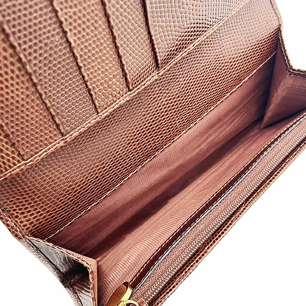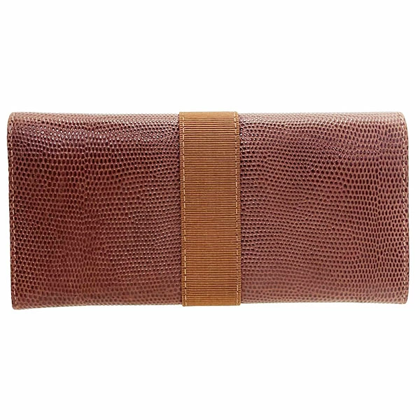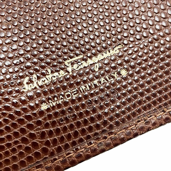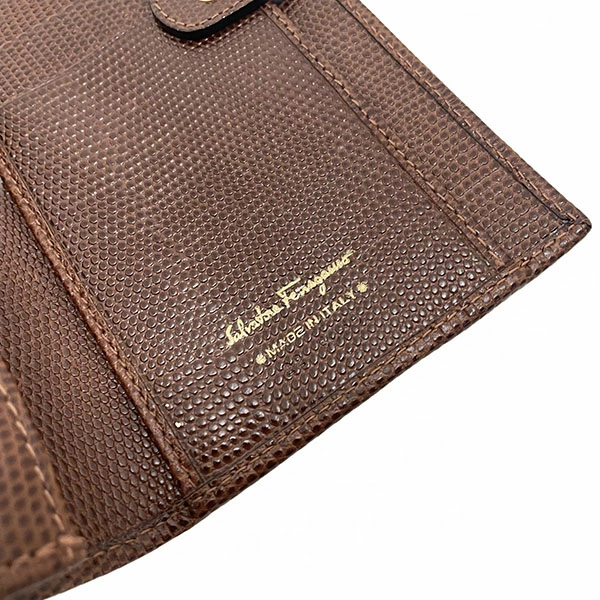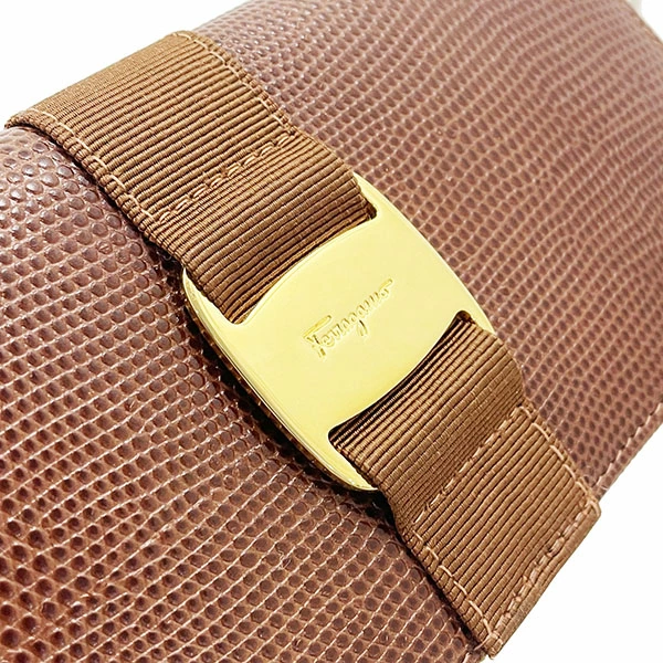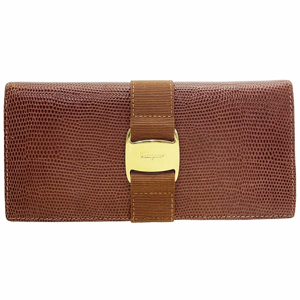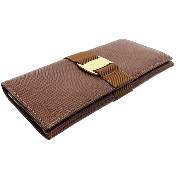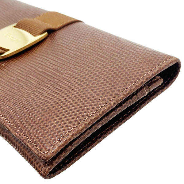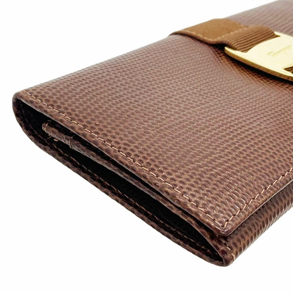 Salvatore Ferragamo Vara Bi-fold Long Wallet, Embossed Leather, Brown, Gold Hardware, Size 22 3059, Ribbon, Women's Wallet [Used]