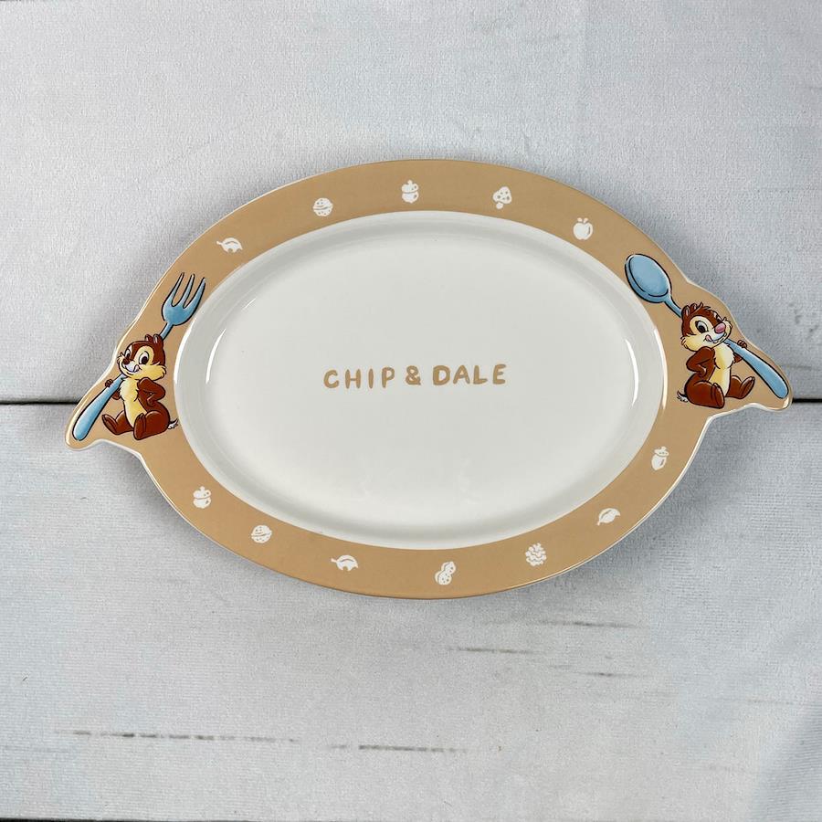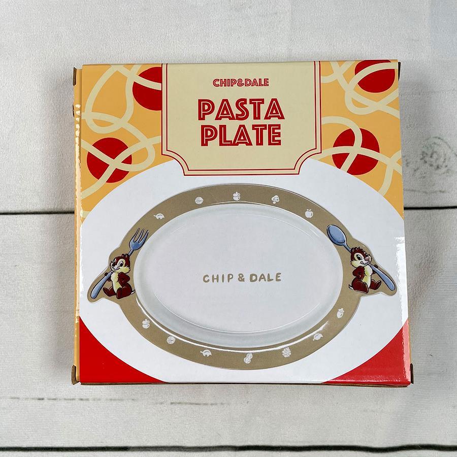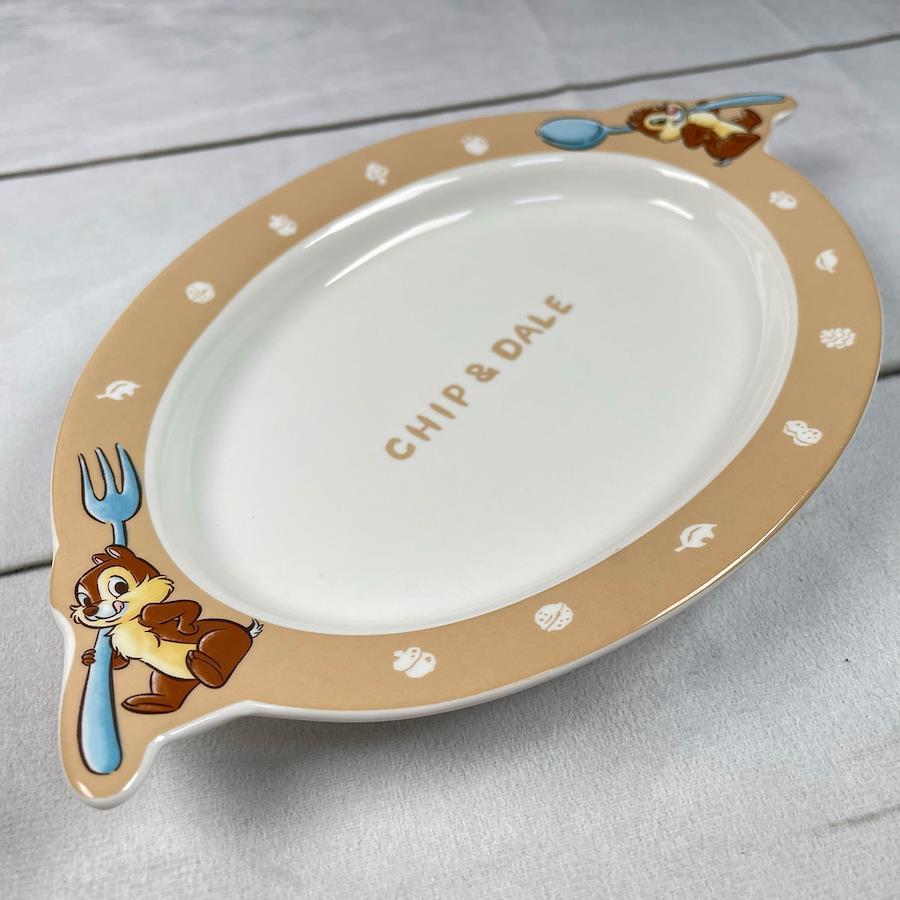 チップとデールのとってもかわいいパスタ皿です。持ちての部分にカトラリーを持ったチップとデールのイラストが描かれています。