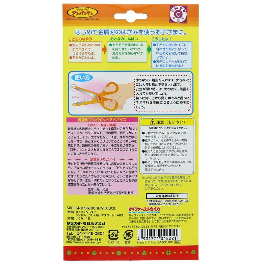 サンスター文具のやってみよう! おけいこはさみ それいけ! アンパンマンは、初めて金属の刃のハサミを使うお子様の練習用。3歳~5歳の子供の手の大きさの平均値を割出し作られた、握りやすさを追求した練習用のハサミ。刃先も丸く加工してあるので指先を切る心配もなく、はさみトレーニングをすることができる。