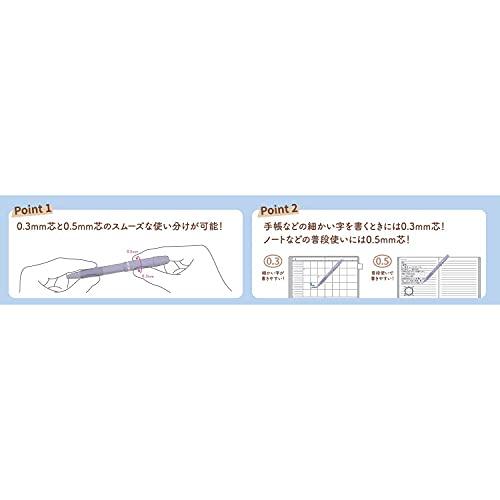右にヒネると0.3mm、左にヒネると0.5mmの2WAYシャーペン。カラーは、ナイトクラウド。消しゴムもついてて、これ一本でノートを書くのが完結します。手帳などの細かい字を書くときは0.3mm芯! ノートなどの普段使いには0.5mm芯!大人気のシャープ&シャープnicoloにペールカラーのラインアップが登場!