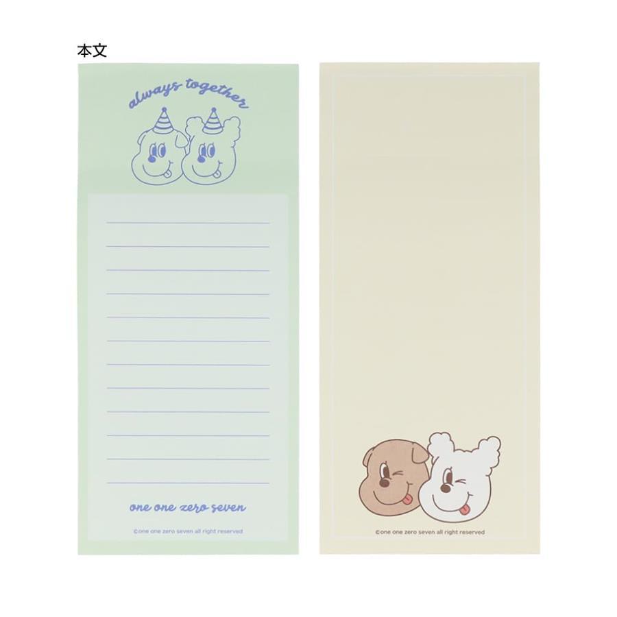 韓国人夫婦が生み出した注目のブランド[1107(イルイルゴンチル)]のステーショナリー【特長】ジッパー袋のパッケージ入の付箋が2柄【内容】付箋:2柄 各25枚 計50枚【サイズ】65mm×145mm×5mm【材質】紙【免責事項】メーカーによる商品リニューアルに伴いパッケージが変更が行われた場合、新パッケージでお届け致します事ご了承願います。