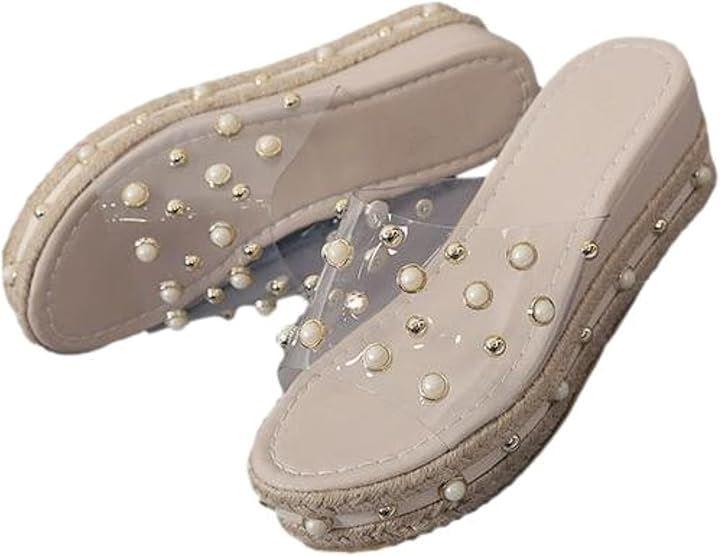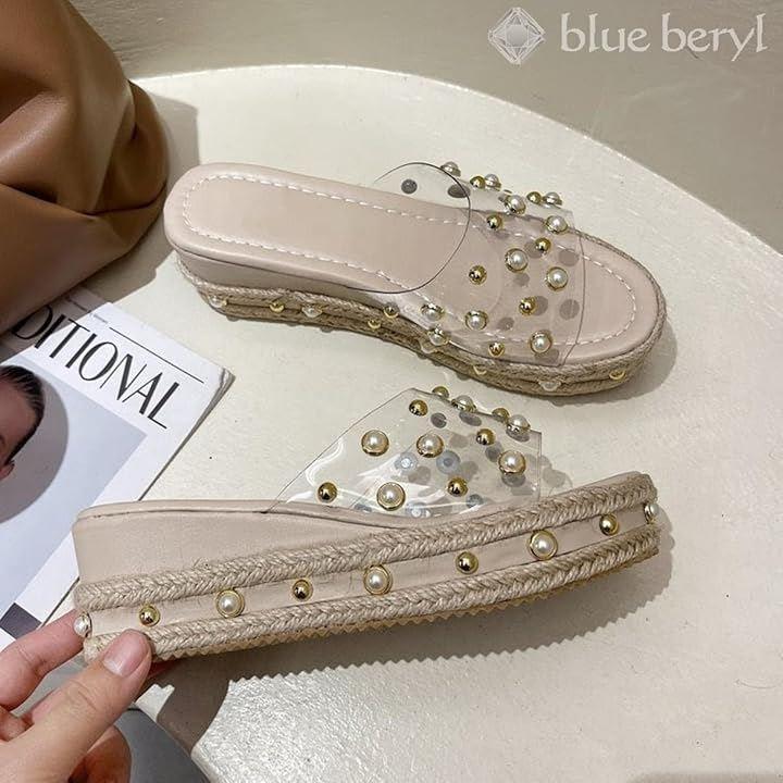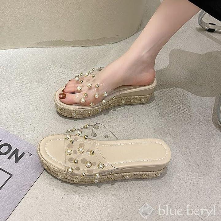 「軽やかで涼しげなクリアサンダル」 ウェッジの周りを 編み込んだロープで覆い、夏ムード満点に仕上げた軽やかで涼しげなクリアサンダル。