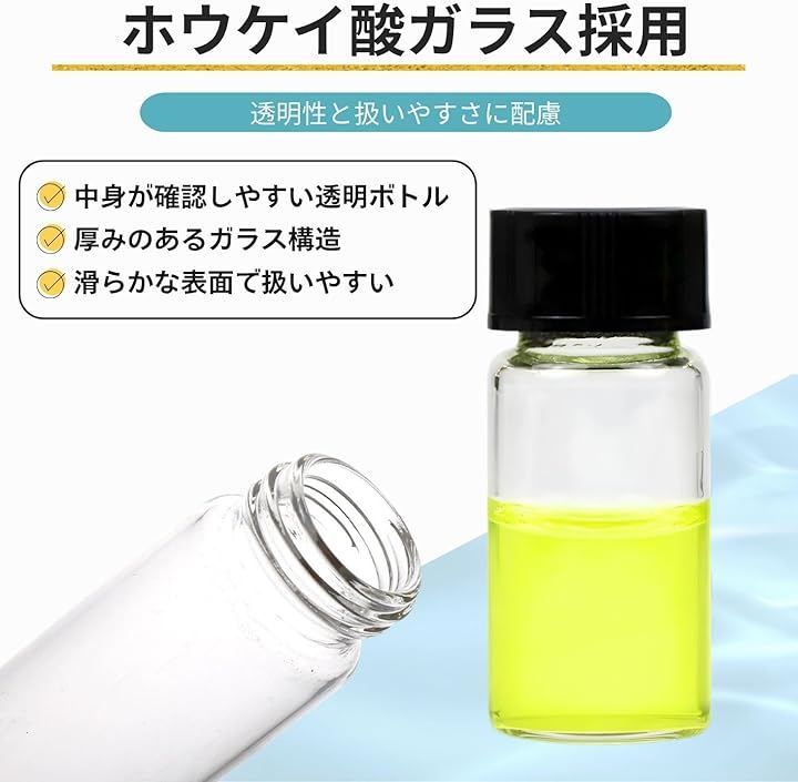 温度変化に強い素材で、アロマオイル、エッセンシャルオイル、香水、化粧水、インク、試薬などの保存容器として使用できます。