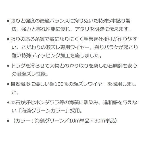 通常1-5営業日で発送:アタリ直感! 5本撚り鋼ワイヤー張りと強度の最適バランスに拘りぬいた特殊5本撚り製法。強力と擦れ性能に優れ、アタリを明確に伝えます張りのある糸質で癖になりにくく手巻き仕掛けが作りやすい、こだわりの瀬ズレ専用ワイヤー。撚りバラケが起こり難い特殊ディッピング加工を施しました。ドラグを滑らせて大物とのやり取りを楽しむ石鯛師も安心の耐瀬ズレ性能。自然環境に優しい鋼100%の瀬ズレワイヤーを採用しました。本石が好むホンダワラ等の海藻に馴染み、違和感を与えない「海藻グリーンカラー」採用。