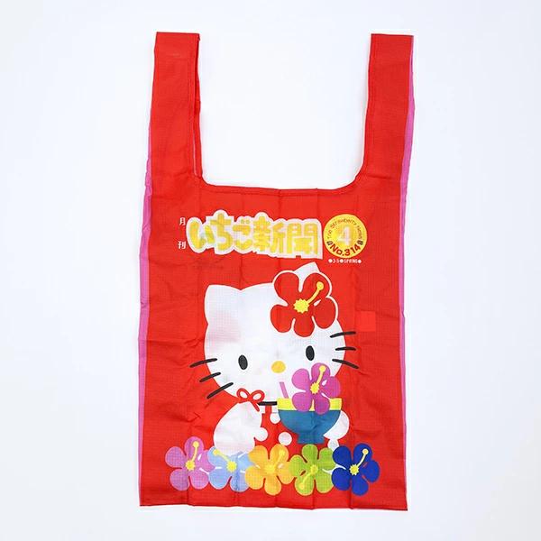 歴代のハローキティの表紙だけを集めました!使いやすい底マチタイプのエコバッグです。いちご新聞50周年を記念して表紙をそのまま使用した柄と歴代アートが並んだ集合した柄の2種類で魅力たっぷりなデザインシリーズ♪いちご新聞は世界中のみんなが仲良く、思いやりの心を大切にしてほしいという想いを伝える新聞として、いちごの王さまの提案で創刊されたよ☆バッグなどに取り付けられるカラビナ付きなのでもしものお買い物時も安心です♪【収納時のサイズ:11.5cm×8cm×3cm】
