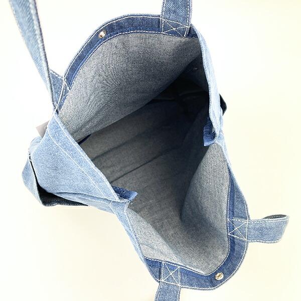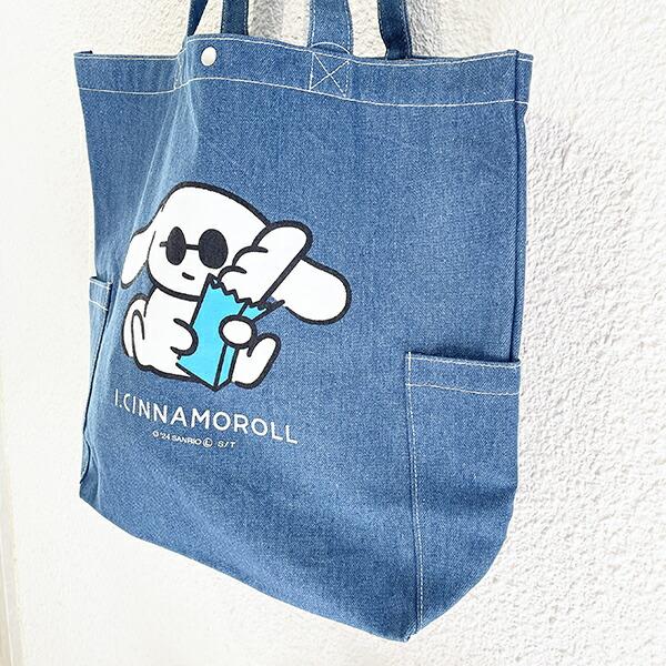 シナモロールのデニムトートバッグです。ちょっぴり大人なシナモンのデザインがキュート♪A4サイズもすっぽり入る大容量!サイドポケット付きも嬉しいポイント♪デニム生地でしっかりしていて、通勤・通学にもぴったりです☆