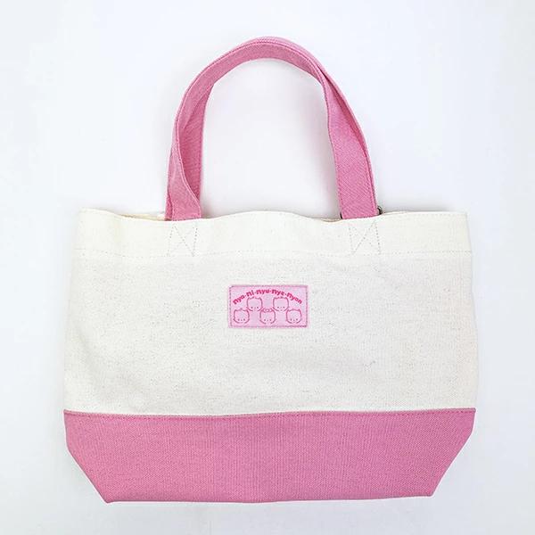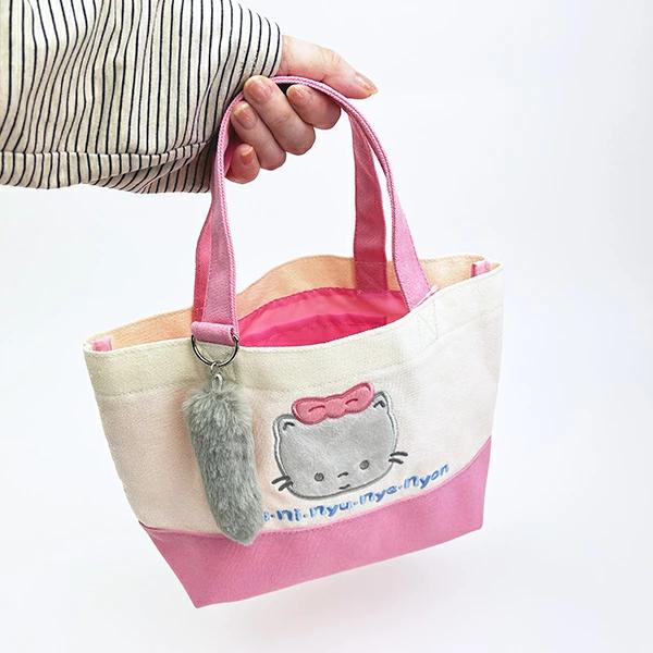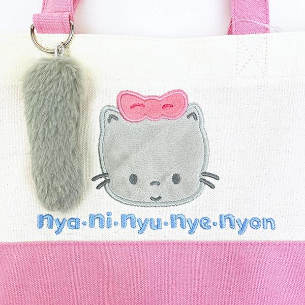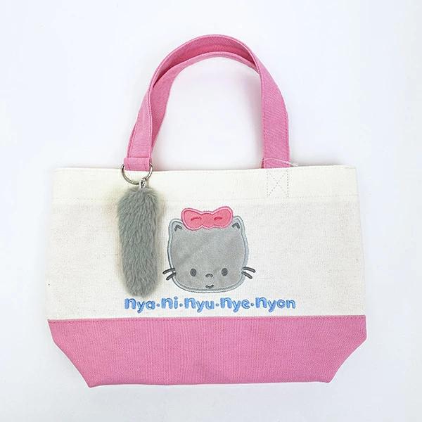 サンリオキャラクターズのネコちゃんシリーズ、キャットシリーズです。こちらはニャニィニュニェニョンのミニトートです。表はふわふわのニェのお顔。ふわふわのシッポのチャーム付き♪ランチやデイユーズに◎