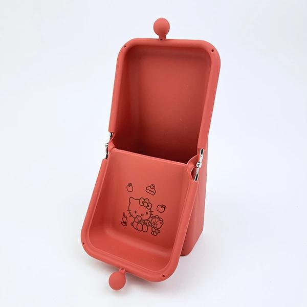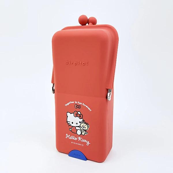 サンリオのシリコーン製の縦型がま口ペンケースです♪ハローキティのイラスト入り◎表側だけでなく内側にもかわいいイラスト◎置くだけでピタッとくっつき倒れない!本体底面の吸盤でピタッとくっつき、空気のチカラでしっかり吸着します(※凹凸のないフラットな面に吸着した場合、垂直方向で3kgの引っ張り強度)。外すときはワンタッチで簡単に外れます。タテにもヨコにもスマホが置ける、大容量でガバッと開くがま口タイプ。シリコン製なので文房具以外に洗面用品や化粧品を入れるのにも便利◎デスク周りや勉強机のごちゃごちゃ感がなくなりスッキリと整理整頓できる♪