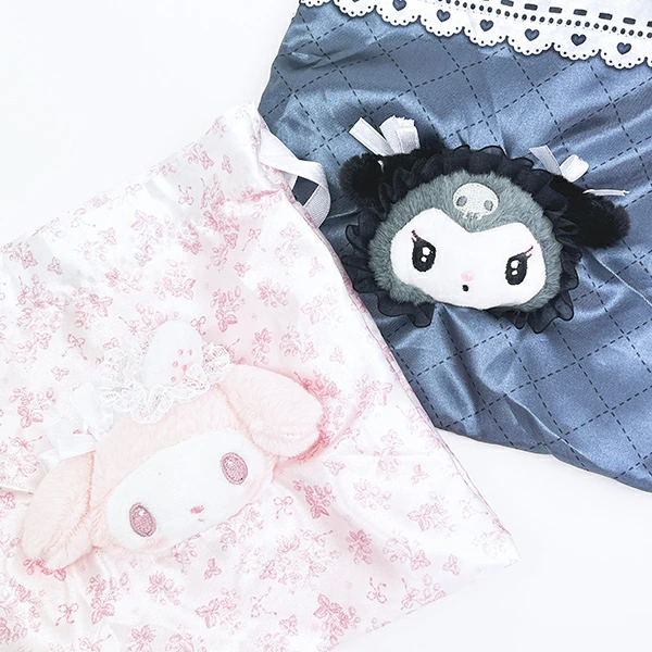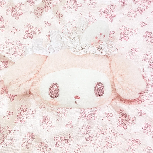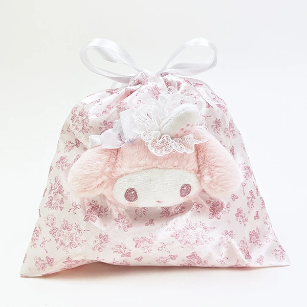 マイメロディのメルヘンチックなデザインのボアフェイス巾着です。マイメロディのバースデーを記念した「トワルドジュイ風」の柄と、淡いピンクの「白イチゴ」をモチーフにしたヴィンテージガーリーなデザインシリーズ♪透け感のあるシフォン素材やオーガンジーフリルが可愛いポイント☆サテン生地が高級感があってgoodです♪