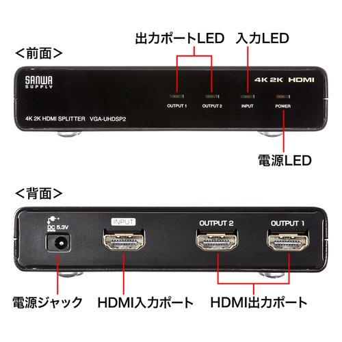 最大4K2K(4096×2160)/60Hz解像度のHDMI出力に対応したHDMI2分配器。<仕様>■分配内容:2分配■インターフェース:入力用/HDMI タイプA(19pin)メス×1出力用/HDMI タイプA(19pin)メス×2■信号方式:TMDSシングルリンク■データレート(最大):3.4Gbit/s■ピクセルクロック:25MHz - 340MHz■最大解像度:4K2K(4096×2160)〈主な対応解像度〉4096×2160ドット@60Hz (4:2:0)4096×2160ドット@30Hz (4:4:4)3840×2160ドット@60Hz (4:2:0)3840×2160ドット@30Hz (4:4:4)1920×1200ドット@60Hz1920×1080ドット@60Hz■入力DDC信号:5V■HDCP:HDCP1.4対応※ディスプレイもHDCPに対応している必要があります。■機器間制御(CEC):対応■消費電力:2W■環境条件:稼動温度0~50℃・稼動湿度80%以下(結露なきこと)保存温度-20~60℃・保存湿度80%以下(結露なきこと)■材質:スチール■サイズ:W120×D80×H25mm■重量:360g■付属品:ACアダプタ(DC 5.3V/2.4A)、HDMIケーブル(1.8m)×1、取扱説明書、保証書■対応機器:HDMI出力端子を標準搭載している映像機器・家庭用ゲーム機・パソコン ■対応出力機器:HDMI入力端子を標準搭載しているテレビ・パソコン用ディスプレイなど■保証:1年