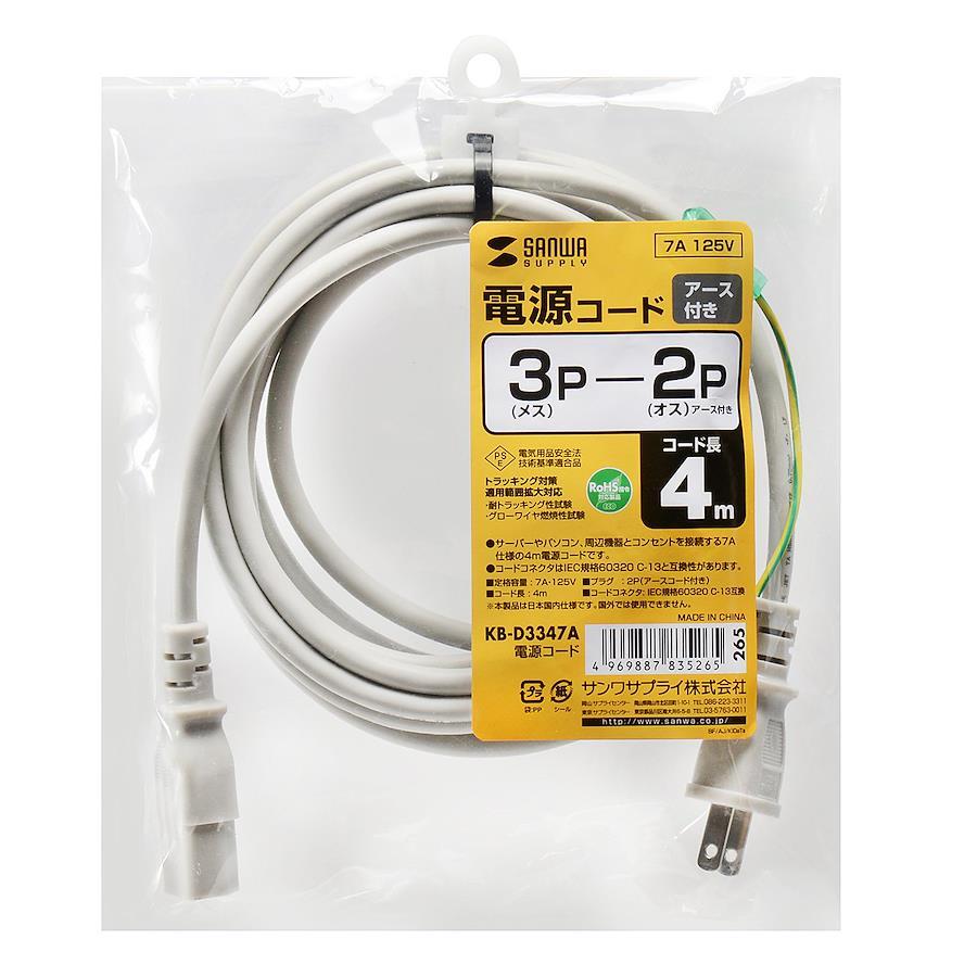 サーバーやパソコン、周辺機器とコンセントを接続する7A仕様の電源コード。2P・ライトグレー・4m。