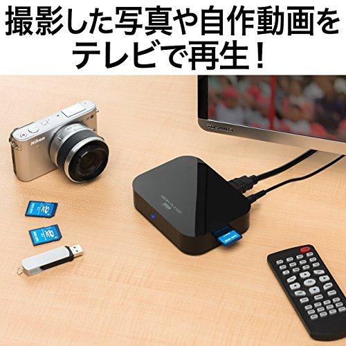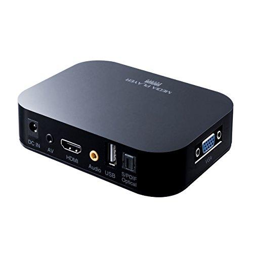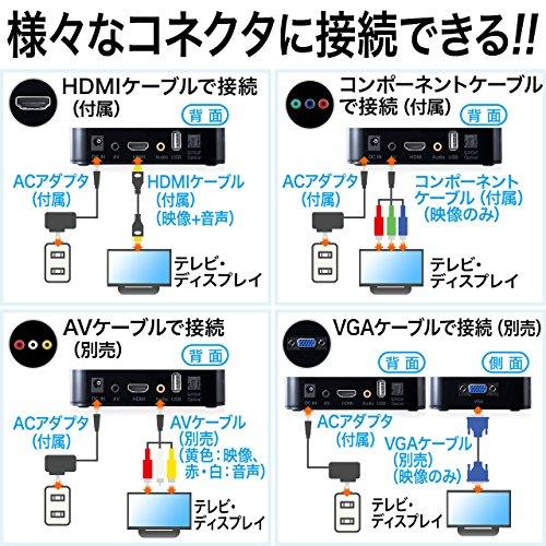 デジカメで撮影した写真や映像、パソコンで作成した動画などを、テレビやプロジェクターで再生できるメディアプレーヤーです。再生したいデータをUSBメモリ、またはSDカードに保存して本製品に接続すれば、パソコンを使うことなく再生できます。動画・音楽ファイル再生時、リモコンのOSDボタンからリピート再生の設定が可能です。画像ファイルのスライドショーができ、リモコンのOSDボタンからスライド効果や再生間隔の変更、BGMの設定が可能です。付属のHDMIケーブルか専用コンポーネントケーブルで、テレビやプロジェクターに出力できます。別売りのVGAケーブル(ミニD-sub15ピン)、別売りの専用AVケーブル(400-MEDI001C)での接続も可能です。電源を入れただけで再生が始まる、オートプレイ機能を搭載しています。設定画面で、「映像」「音楽」「写真」から、選択した種類のファイルが自動で再生されます。