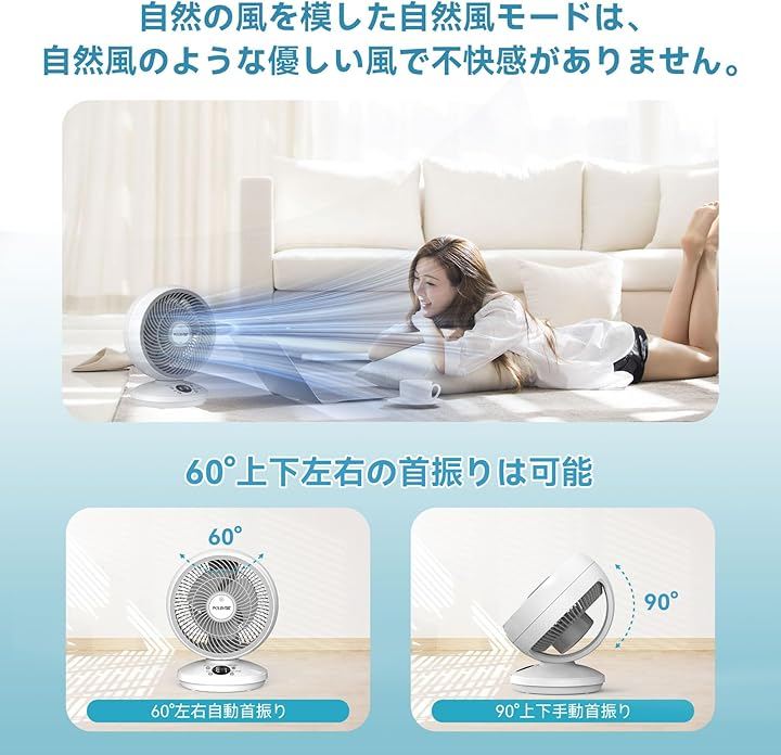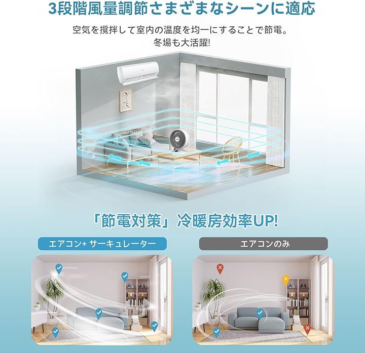これにより、夏はエアコンと併用することで涼しく、冬は暖房と併用することで暖かい空気を効果的に循環させ、季節を問わず快適な室内環境を提供します。