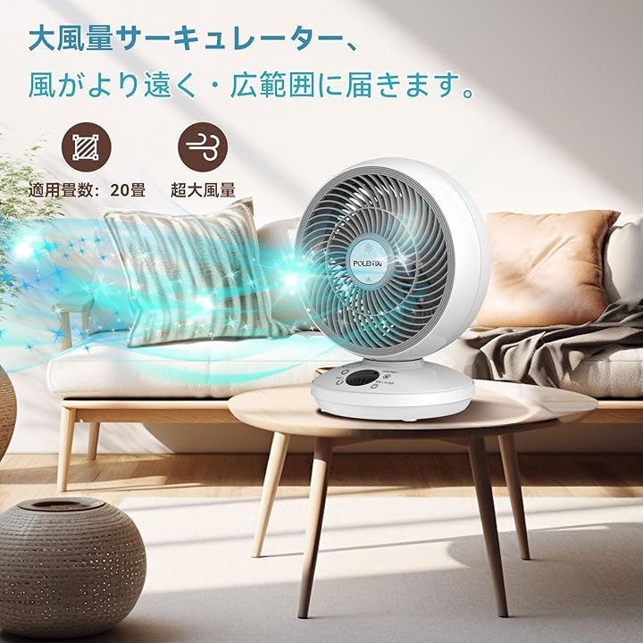 「強力な風量と広範囲送風」このサーキュレーターは、強力なモーターを搭載しており、パワフルな風量で部屋全体に風を送り出します。