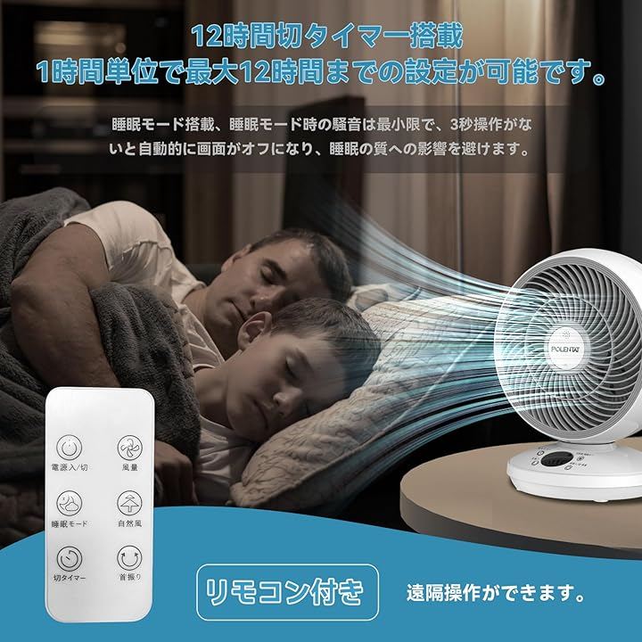 さらに、リモコン操作にも対応しており、手元で簡単に電源のオン/オフ、風量調整、タイマー設定ができます。