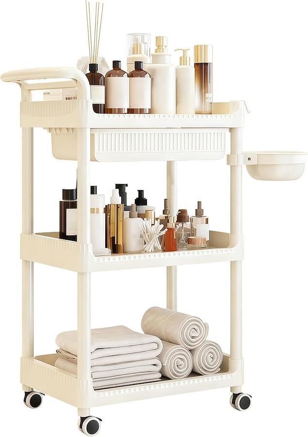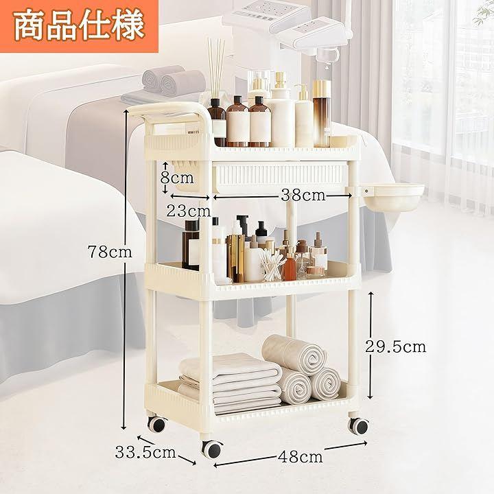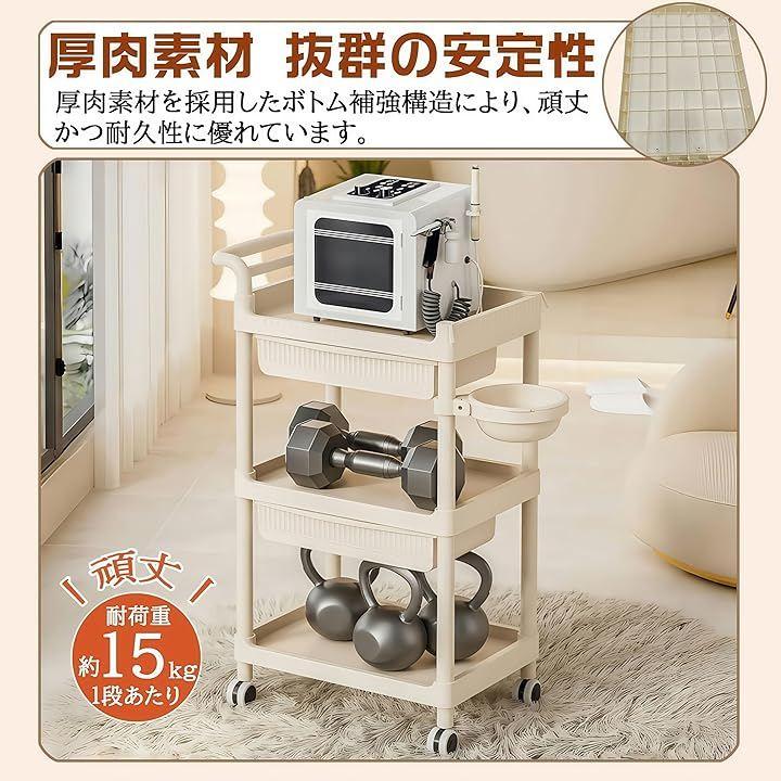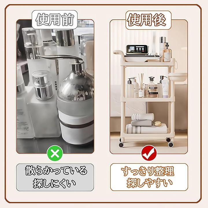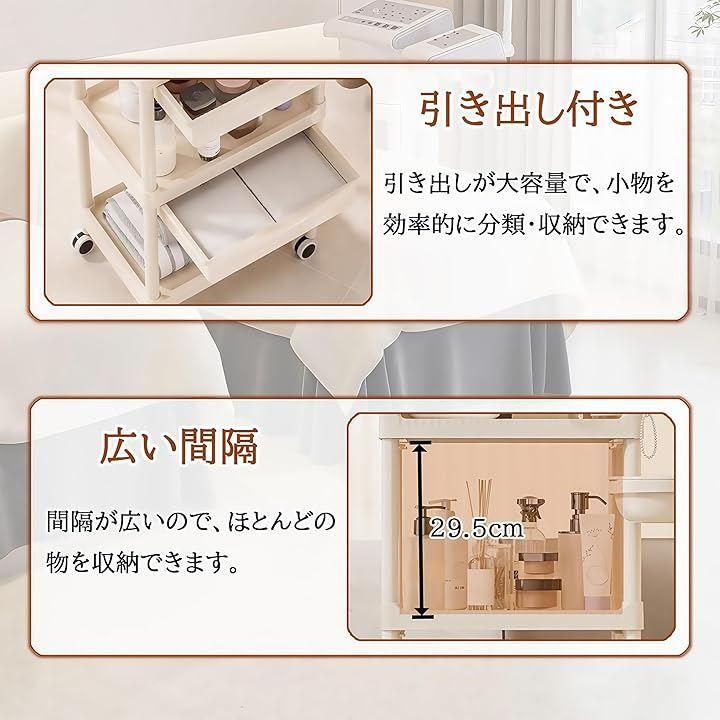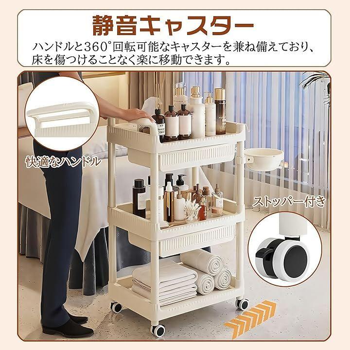 「キャスター付き 移動便利」この収納ワゴンはハンドルと360°回転可能なキャスターを備えており、床を傷つけることなく楽に移動できます。
