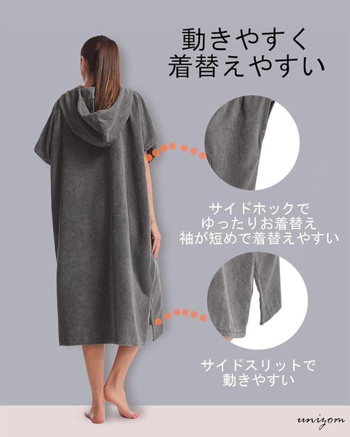 「商品仕様」*サイズ:着丈110cm、幅85cm *素材:マイクロファイバー(ナイロン10%、ポリエステル90%) *重量:600g *用途:海、プール、マリンスポーツの着替えに/キャンプなどのアウトドア時の着替えに/各種レジャーの着替えに/お風呂上がりのバスローブに/部屋着に *ブランド:unizom