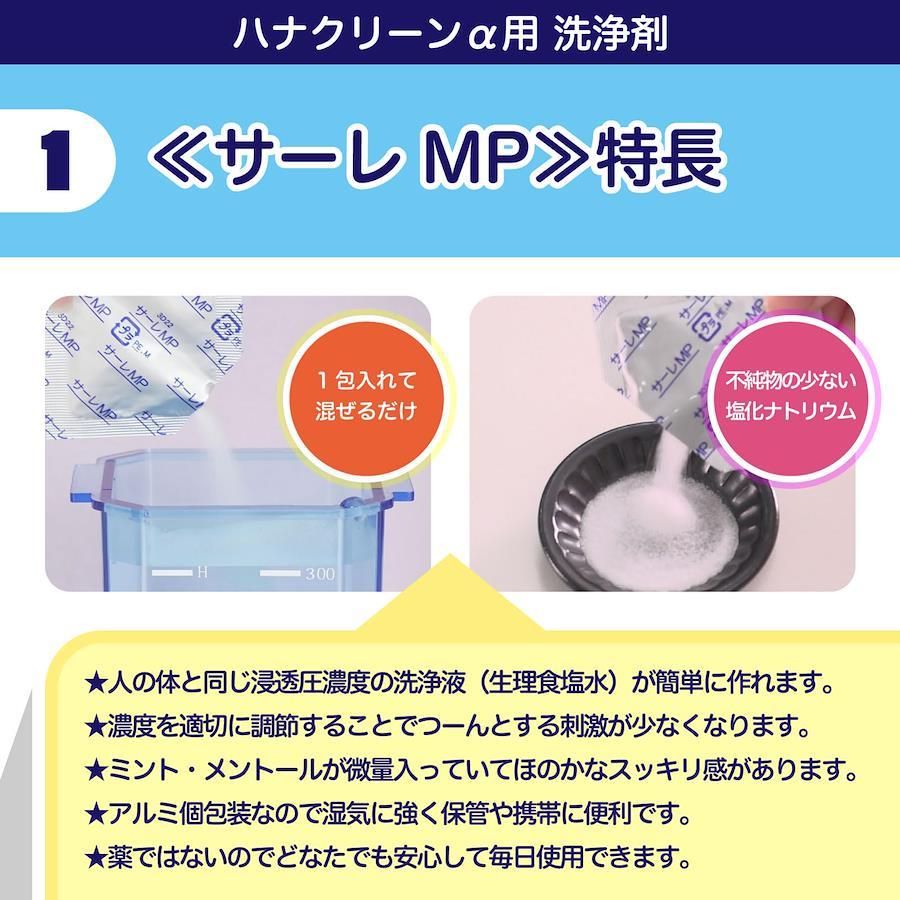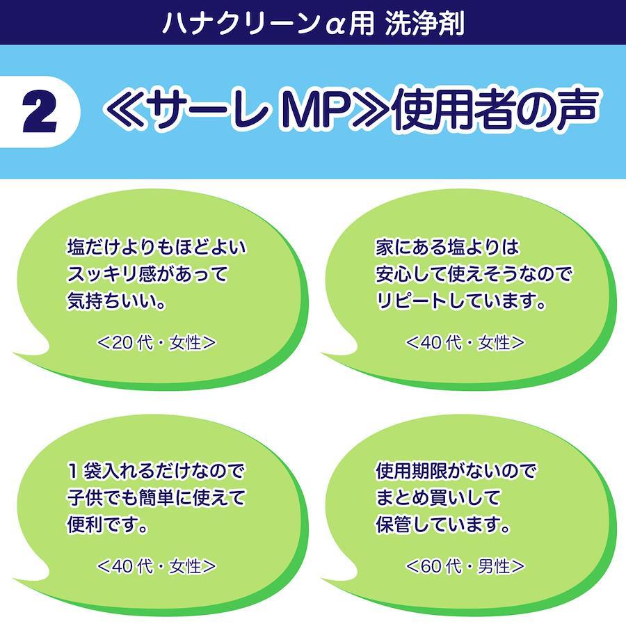 ●ハナクリーンのボトルに入れた300mlの温水にサーレMPを1包(3g)入れ、よく溶かして使用してください。