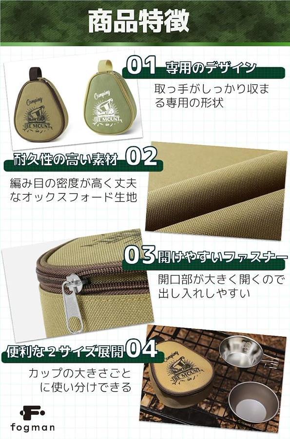 「商品特徴」(1)専用のデザイン:取っ手がしっかり収まる専用の形状/(2)耐久性の高い素材:編み目の密度が高く丈夫なオックスフォード生地/(3)開けやすいファスナー:開口部が大きく開くので出し入れしやすい/(4)便利な2サイズ展開:カップの大きさごとに使い分けできる