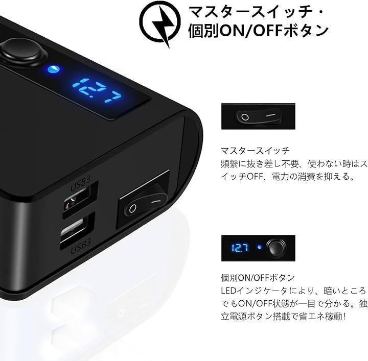 シガーソケットパワー供給は最大180W出力、ポータブルナビ、ドライブレコーダー、車載監視カメラ、スマートフォン、タブレット、車載冷蔵庫、車用掃除機、ゲーム機など同時に複数の機器に給電できます。