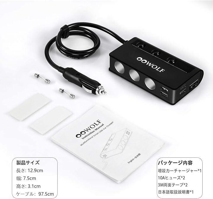 QC3.0搭載 増設カーチャージャー (12.9x7.5x3cm ケーブル長さ:1m) x1、ヒューズx2 (総計3本) 、3Mテープx2、面ファスナーx1、日本語取扱説明書x1