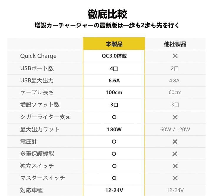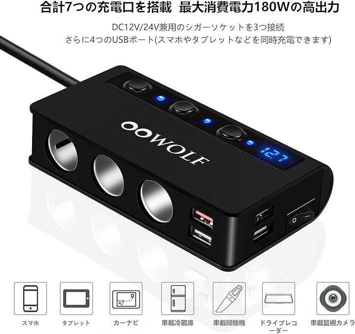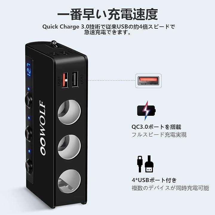 シガーソケットusbには3つのUSBポート(最大3.6A)+QC3.0充電ポート(3.0A)が搭載し、複数なデバイスを同時に急速充電できます。