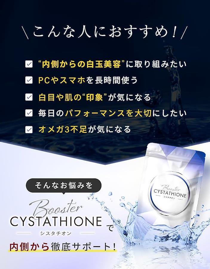 「トリプル処方」 シスタチオンブースターは、ワンランク上の白玉美容を目指して、アルガトリウム、ルテマックス2020(フリー体ルテイン&ゼアキサンチン)、クリルオイルを黄金比率で配合した日本製サプリメントです。