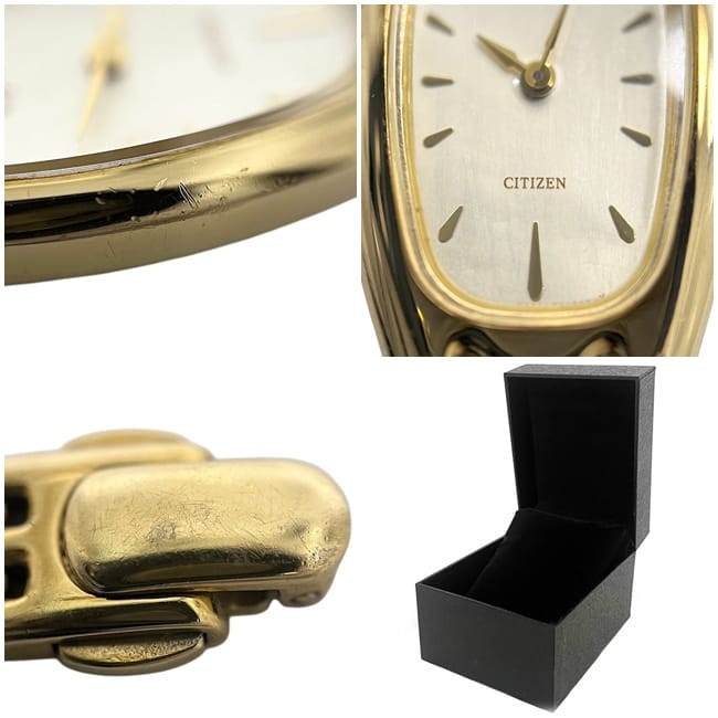 商品名:腕時計オーパスブランド名:シチズン/CITIZEN商品ランク:ABランク素材:SSサイズ:(約)ケースw:17.5mm(リューズ省)×d:6.5mm、ラグ幅:9mm、腕周り:17cm総重量:約34.4g/1.21oz型番・品番:5421-F46924-YOシリアル:650***カラー:文字盤:ゴールド、ケース・ブレス:ゴールドムーブメント:クオーツ仕様:二針付属品:当社オリジナル保存箱詳細説明:電池交換済み・動作確認済みです。全体的に傷有、使用感はございますが比較的綺麗なお品物です。保証・ご注意:時計の保証期間は商品到着日より3ヶ月間とさせて頂きます。使用した際の破損や水没したなどお客様都合による保証については、保証対象外となりますので、予めご了承下さい。 ※撮影時の環境によって、実物と写真で多少色合い等に違いがある場合がありますので、予めご了承下さい。※管理ナンバー:f-25330no,0300321260418