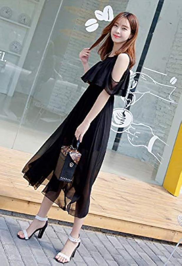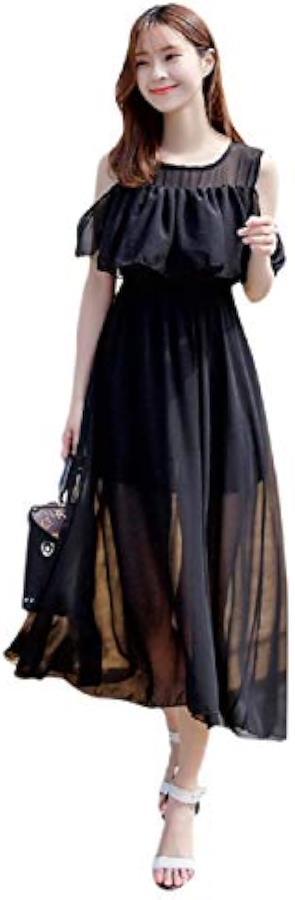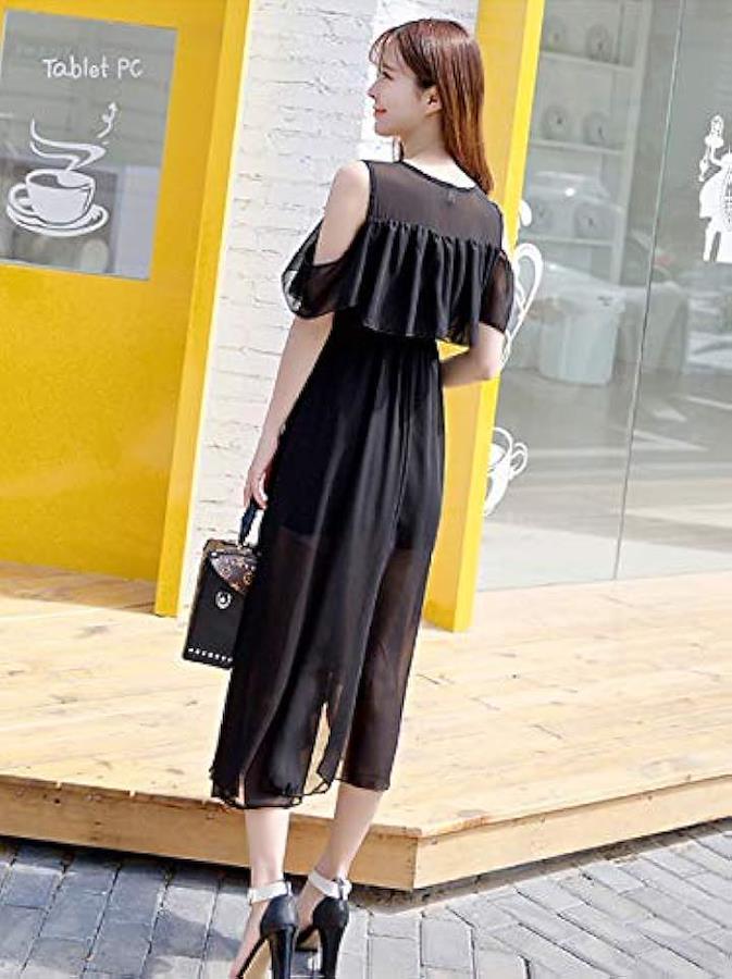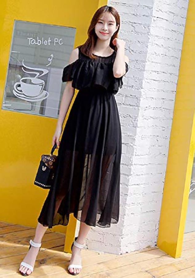 肩出しで、肩やデコルテラインはすっきりと、胸元は生地の重なりでふんわり感がありメリハリのあるシルエットに。