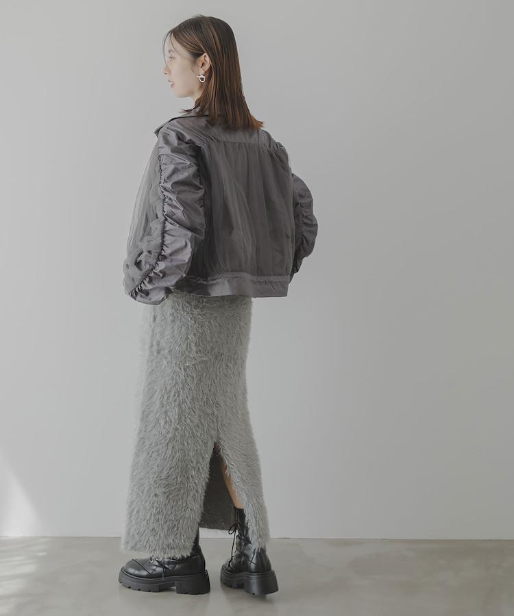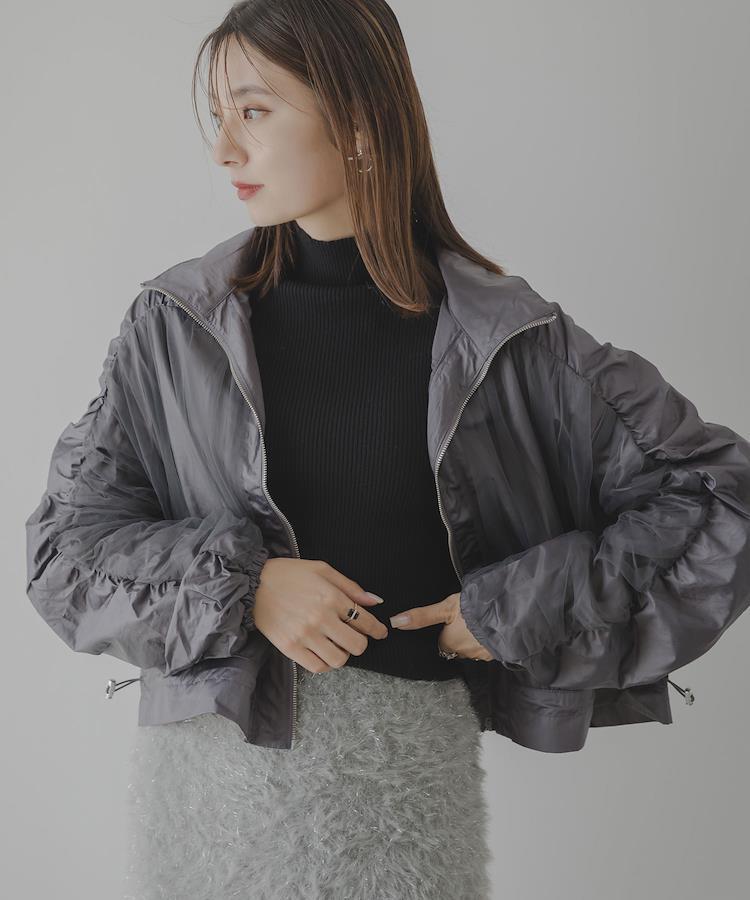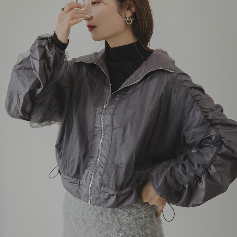 パールタフタ×チュールをドッキングさせたブルゾン。