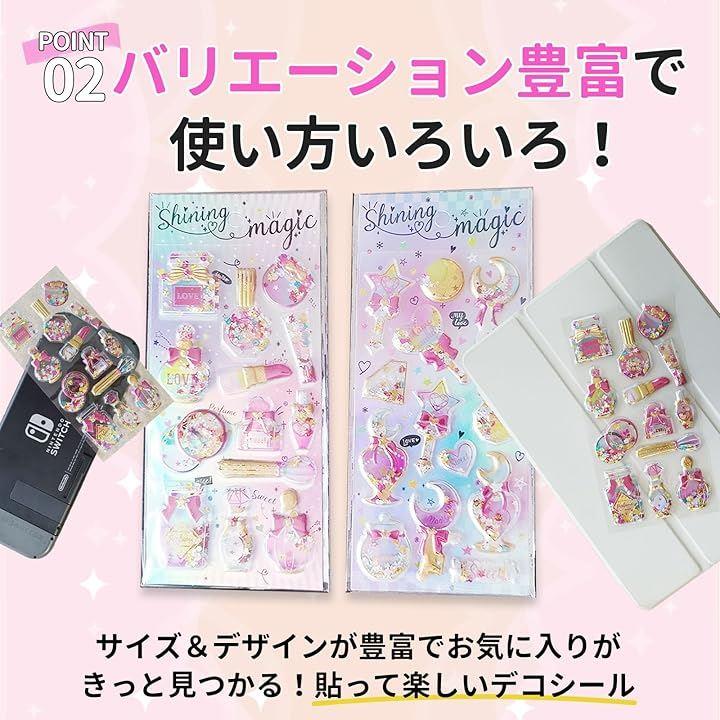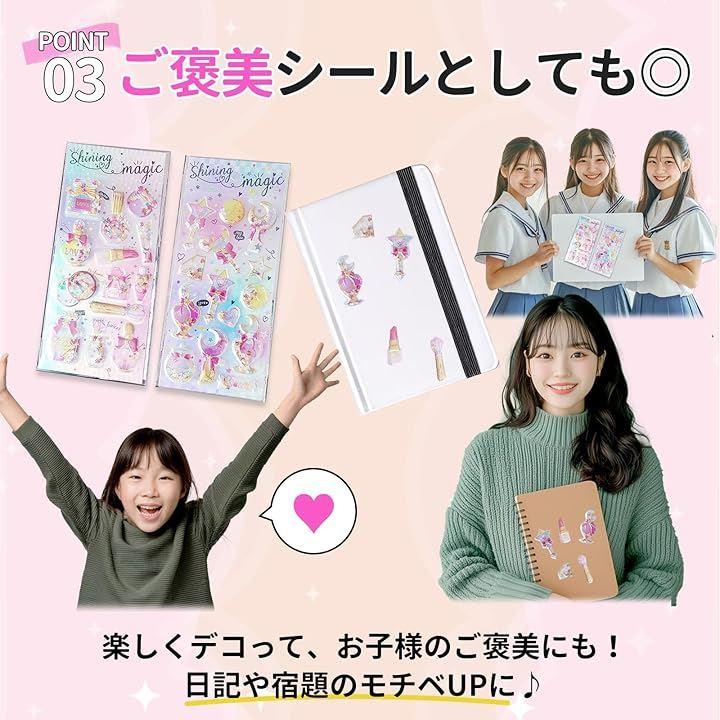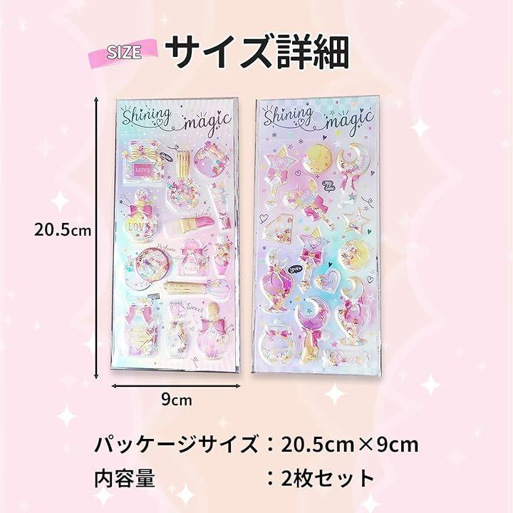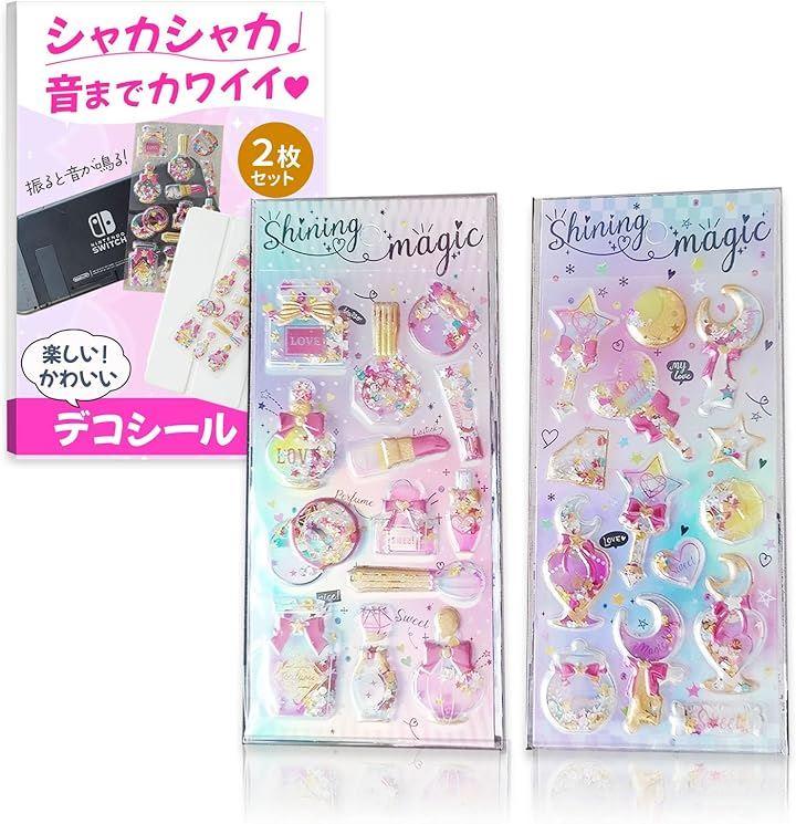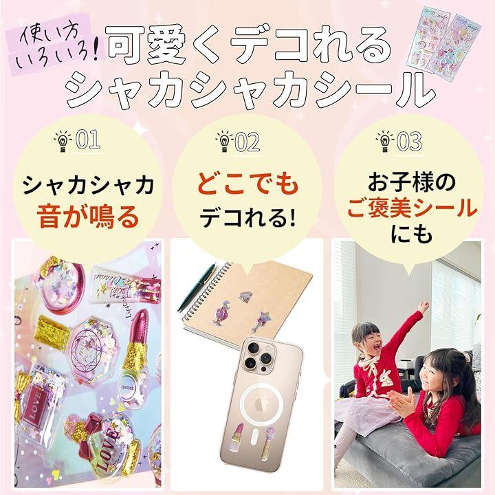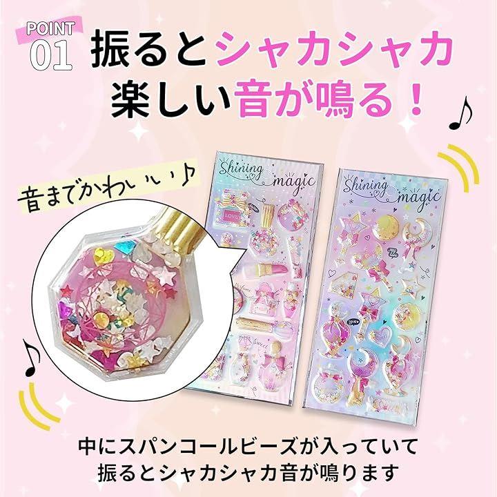シールの中に小さなビーズやスパンコールが入っており、振ったり動かしたりすると中の素材がシャカシャカと音を立てたり、動いたりする楽しいシールで、子供向けの文房具やおもちゃとして人気があります。