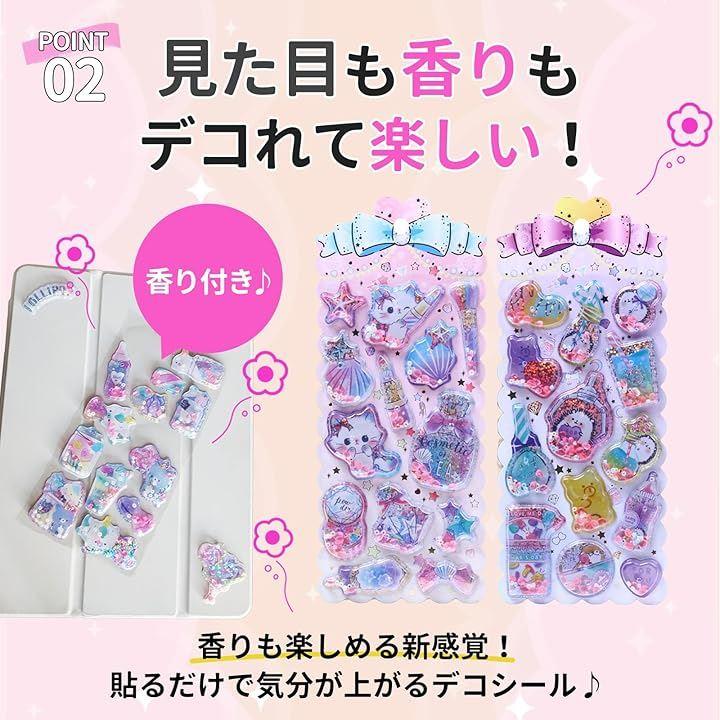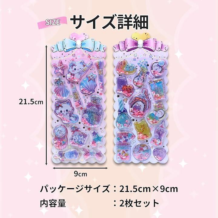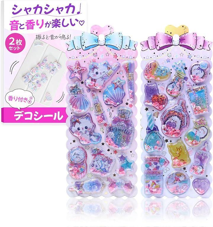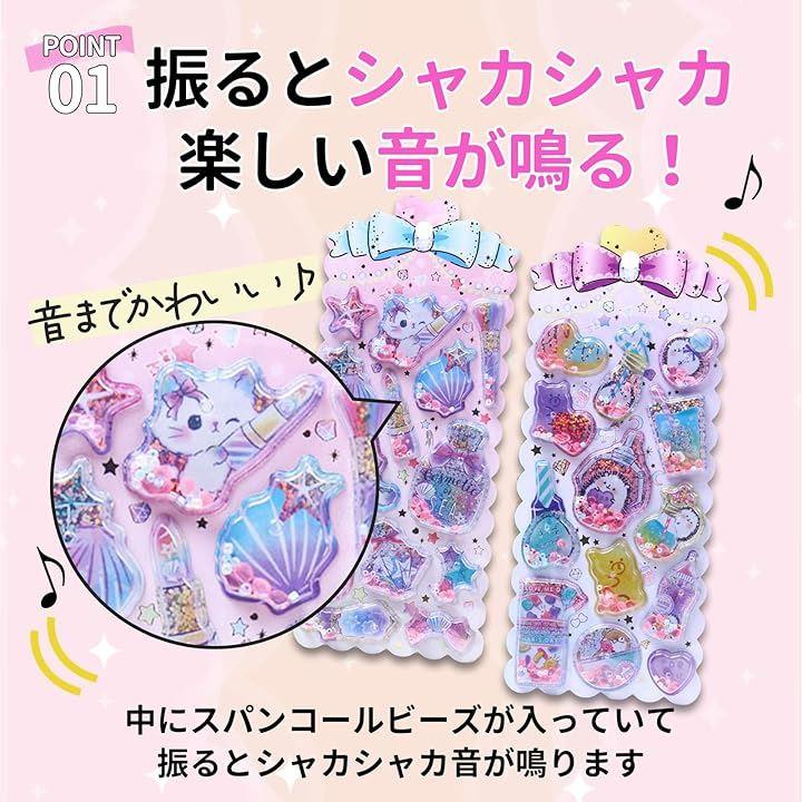 シールの中に小さなビーズやスパンコールが入っており、振ったり動かしたりすると中の素材がシャカシャカと音を立てたり、動いたりする楽しいシールで、子供向けの文房具やおもちゃとして人気があります。