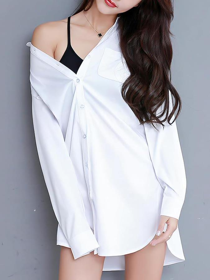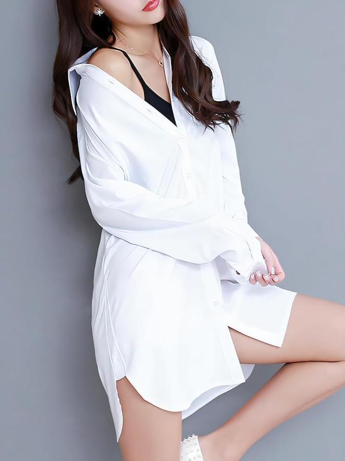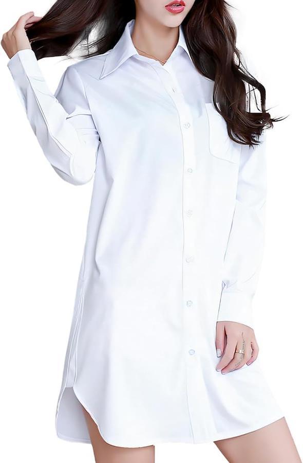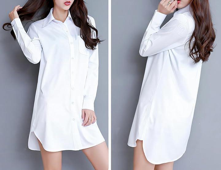 シンプルなデザインの白いシャツは、どんなスタイルにも溶け込む多用途アイテム。