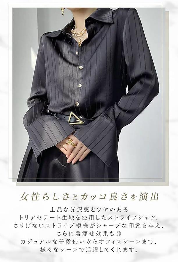 ポイント(1):女性らしさとカッコ良さ溢れる上品なツヤと光沢感が魅力なストライプシャツ。