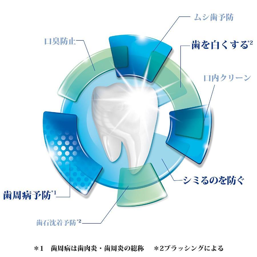 ・7つの働き(シミるのを防ぐ、歯周病予防、歯を白くする、ムシ歯予防、口臭防止、口中クリーン、歯石沈着予防)がひとつに。・歯がしみるのを防ぐ。歯周炎の予防。歯肉炎の予防。むし歯の発生および進行の予防。口臭の防止。歯を白くする。口中を浄化する。口中を爽快にする。