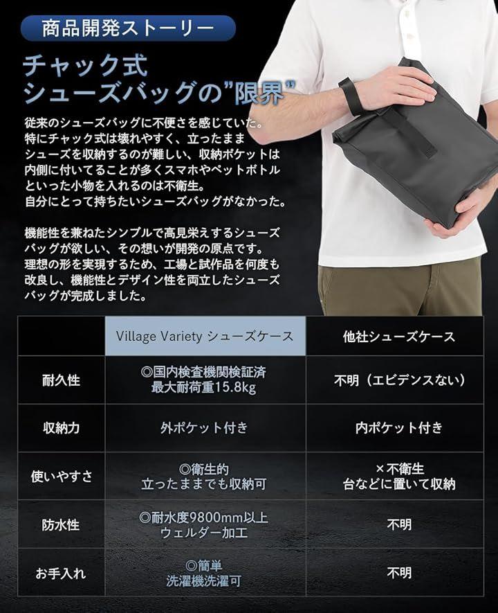 Village Variety は、立ったままでもスムーズに シューズ を出し入れでき、小物類を清潔に収納できる外側ポケットを備えた 靴袋 を目指しました。
