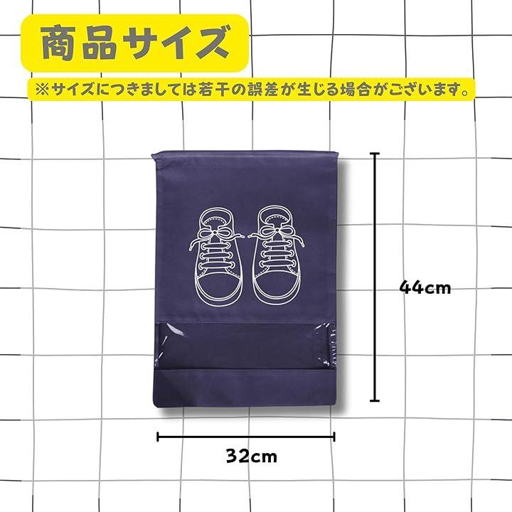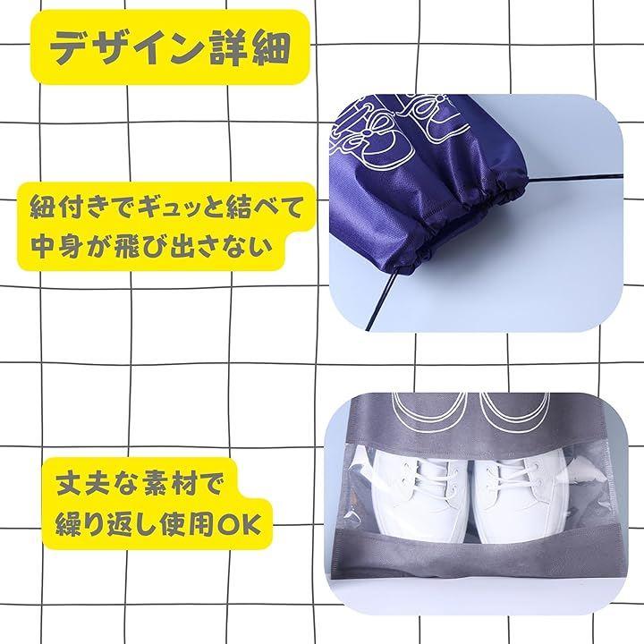 「パッケージ内容」4色のシューズバッグ(グレー、ブラック、ネイビー)で、サイズは約32cmx44cm。
