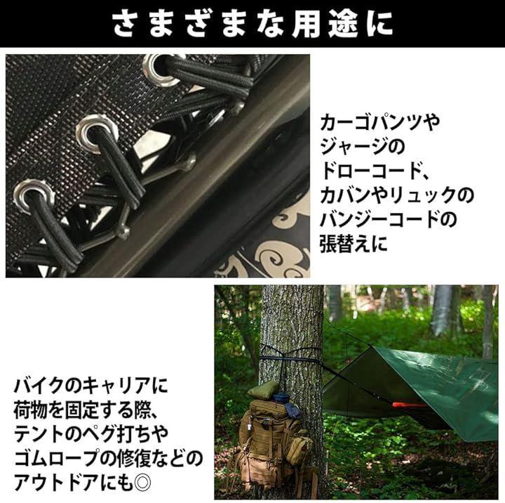 「様々な用途に」バイクのキャリアに荷物を固定する際、テントのペグ打ちやゴムロープの修復などのアウトドアから裁縫まで様々な用途にお使い頂けますので、ぜひ劣化したゴム紐の交換にお役立てください。