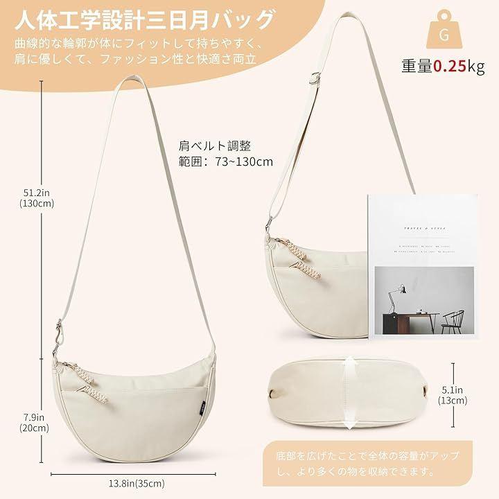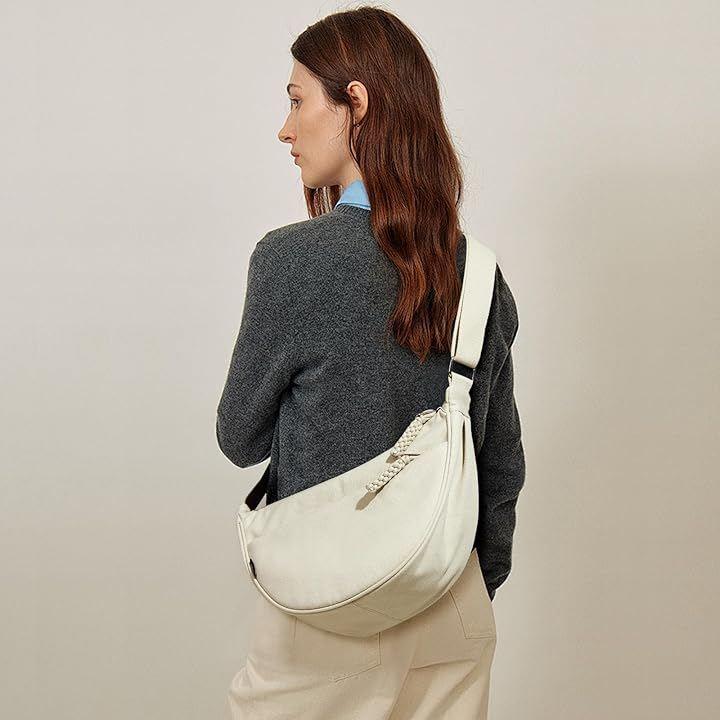 「“ARC”デザイン」この三日月バッグはファッション性と快適さ両立、人体工学設計、曲線的な輪郭が体にフィットして持ちやすく。