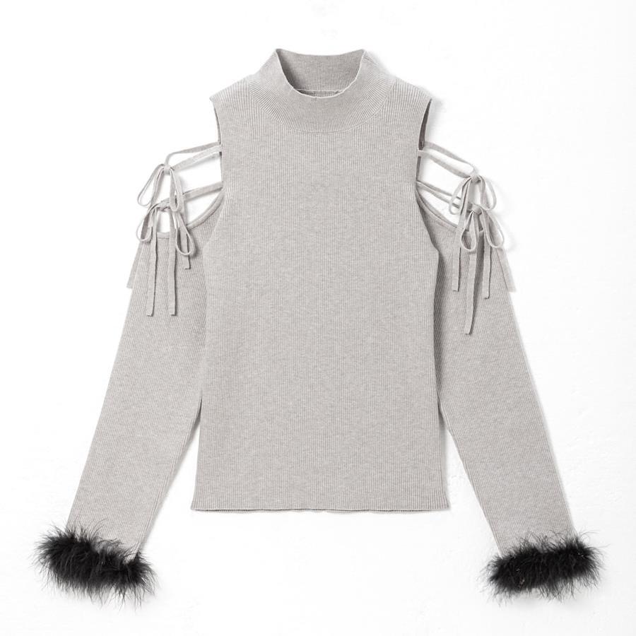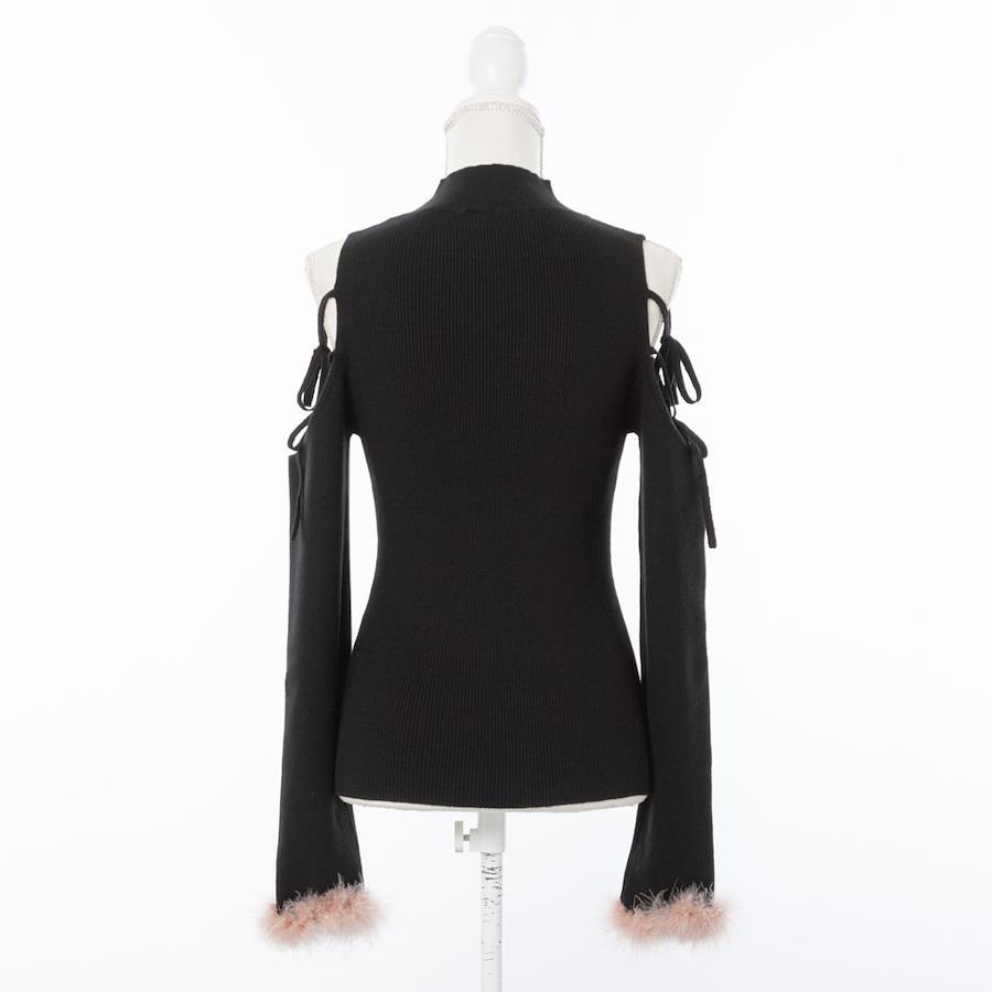 甘さが魅力のガーリーな垢抜けリブニット【デザイン】肩から覗く程よい肌見せをリボンでフェミニンに仕上げたデザイン。袖口にあしらった繊細なマラボーファーが愛らしく、一枚で着映えするアイテムとなっています。また、プチハイネックにオープンショルダーのバランスが上半身をすっきりと見せ、コンパクトに着?せするシルエットに。ベーシックなデザインなので、デニムからロングスカートまで幅広い系統に合わせていただけるのも特徴です。全面リブで編み立てた肌馴染みの良い着心地で、デイリーにお使いいただけるデザイントップスは重宝すること間違いなし!【素材】伸縮性に優れた柔らかいリブニット素材です。