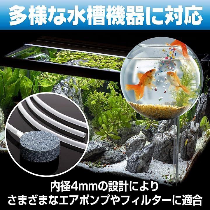 「内径4mm エアチューブ – 多様な水槽機器に対応」 内径4mmの設計により、さまざまなエアポンプやフィルターに適合。
