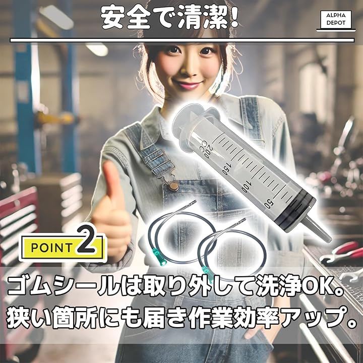「幅広い用途」車やバイクのオイル差し、エア抜き、液体の計量など、多用途に使えます。