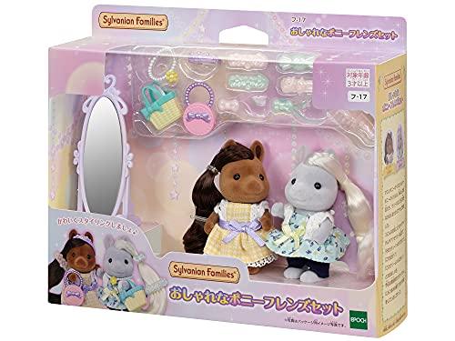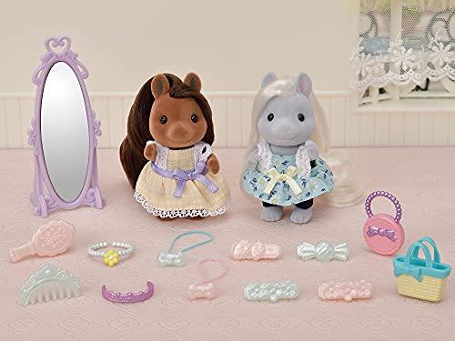 さらさらヘアーのポニーの女の子ふたりと、おしゃれなスタンドミラー、ヘアアクセサリー、ファッション小物のセットだよ! ヘアアレンジをしたり、バッグやアクセサリーを組み合わせて、トータルコーディネートを楽しもう♪ 「おしゃれにスタイリング! ビューティーヘアサロン」といっしょに遊ぶともっと楽しいよ!